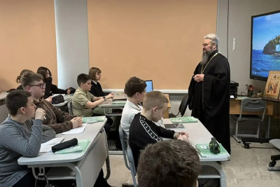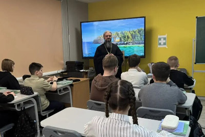 Священник рассказал школьникам о прошедшем празднике Входа Господня в Иерусалим и предстоящем празднике Благовещения Пресвятой Богородицы, а также ответил на интересующие ребят вопросы.