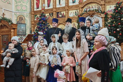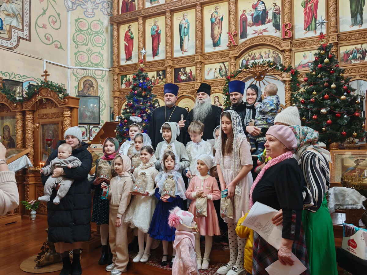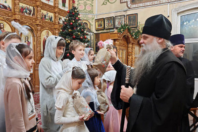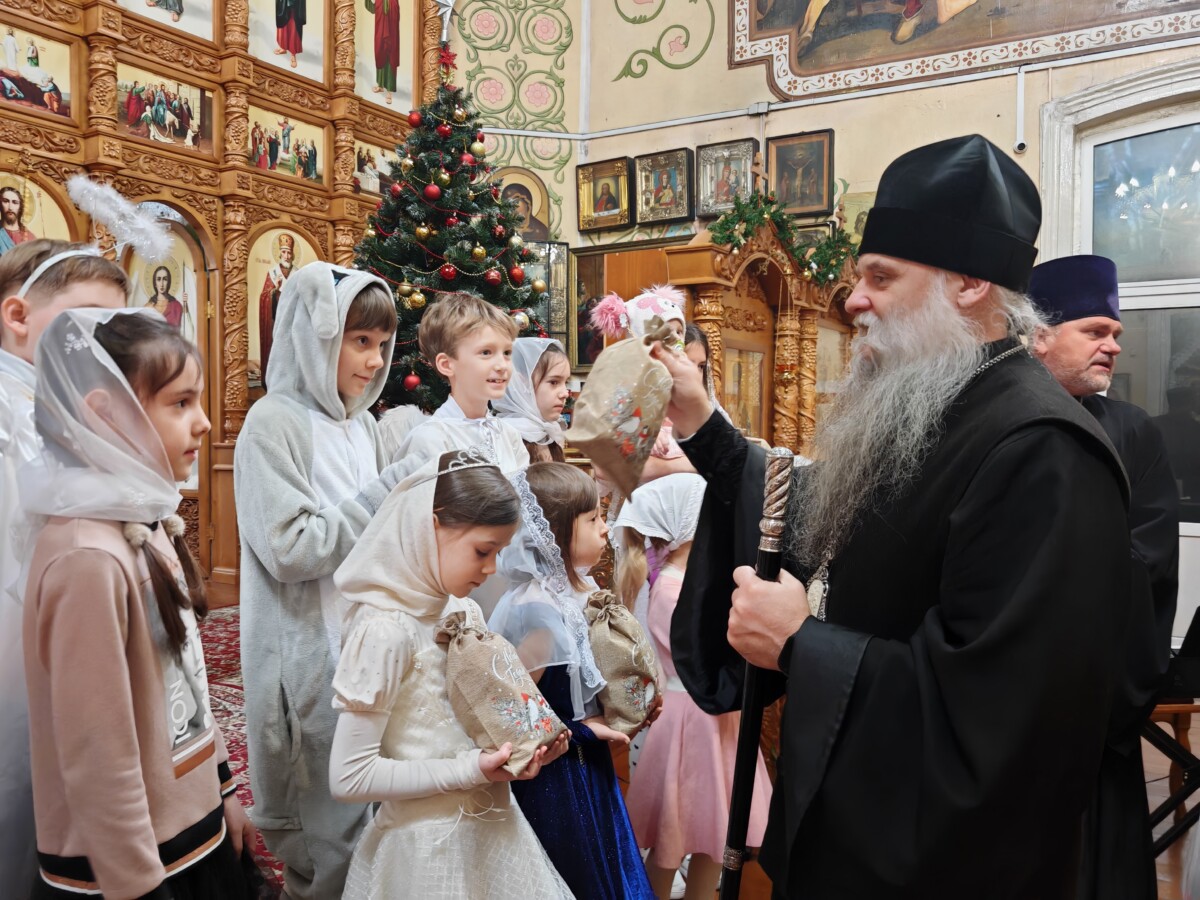 По окончании выступления Преосвященнейший Владыка обратился к присутствующим со словами поздравления и благодарности за подготовленный спектакль, после чего всем участникам вручил сладкие подарки.
