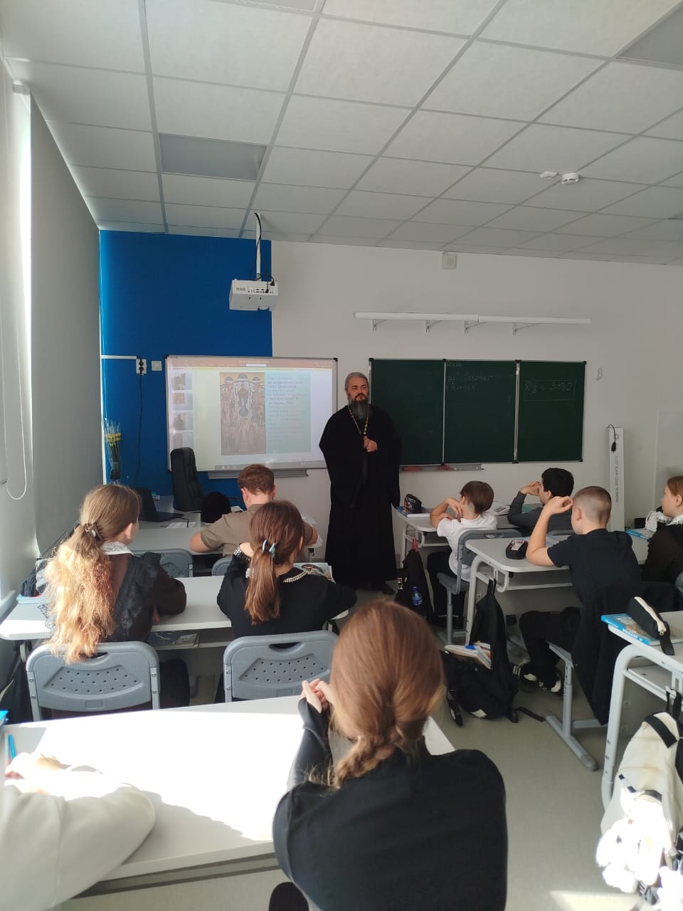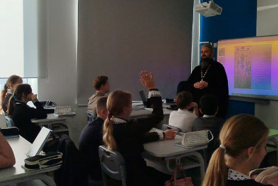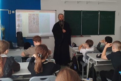 Священник рассказал школьникам о празднике Покрова Пресвятой Богородицы, о том, какие исторические события легли в основу этого праздника, и о том, что Матерь Божья всегда ограждает верующих от всякого зла честным Своим омофором.