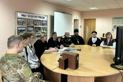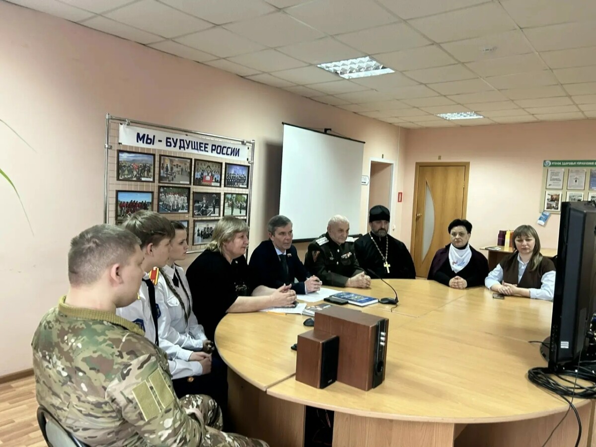 За круглым столом собрались представители управления образования, отдела ЗАГС администрации Валуйского муниципального округа, фонда «Защитники Отечества», Валуйской епархии, казачества, участники СВО. Представители центра патриотического воспитания Калининского района Санкт-Петербурга, педагоги и обучающиеся школ Валуйского муниципального округа и Калининского района города Санкт-Петербурга смогли подключиться к встрече онлайн.