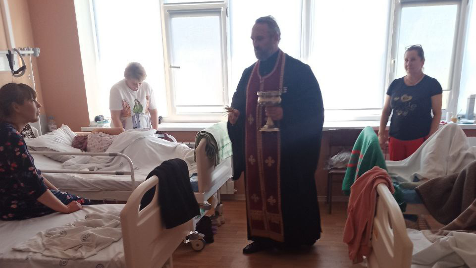 Священники совершили обход палат с больными, где окропили всех желающих святой водой и записали их имена для церковного поминовения на Божественной Литургии.
