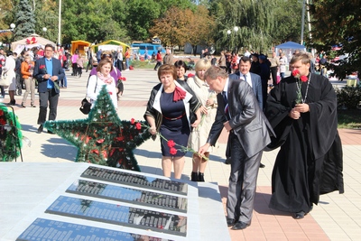 Перед началом официальной части мероприятия глава администрации муниципального района Алексей Дыбов и почетные гости праздника возложили цветы к мемориалу «Скорбящая мать».
