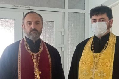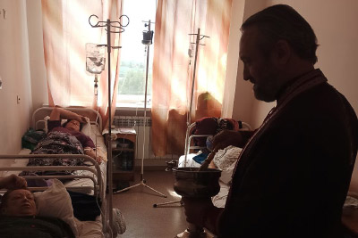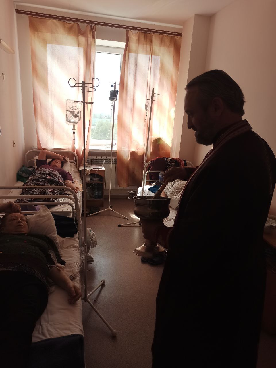 Священники совершили обход палат с больными, где окропили всех желающих святой водой и записали их имена для церковного поминовения на Божественной литургии.