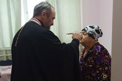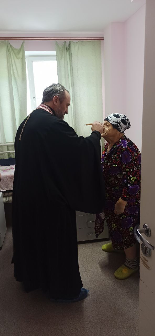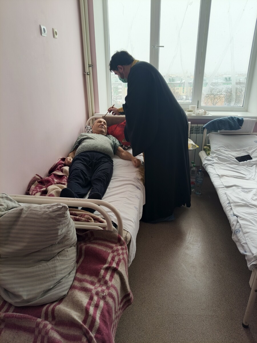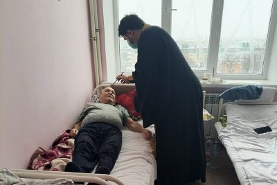 Священники совершили обход палат с больными, где окропили всех желающих святой водой, помазали святым елеем и записали их имена для церковного поминовения на Божественной литургии.