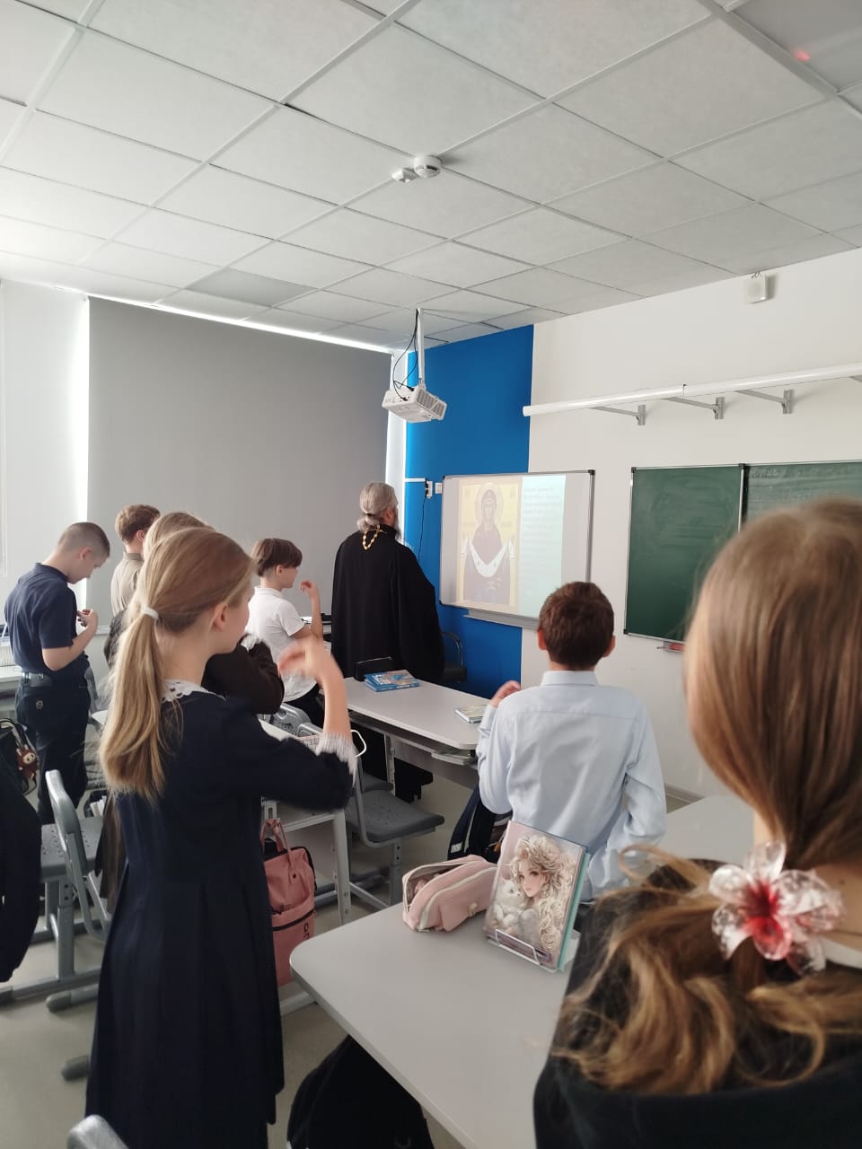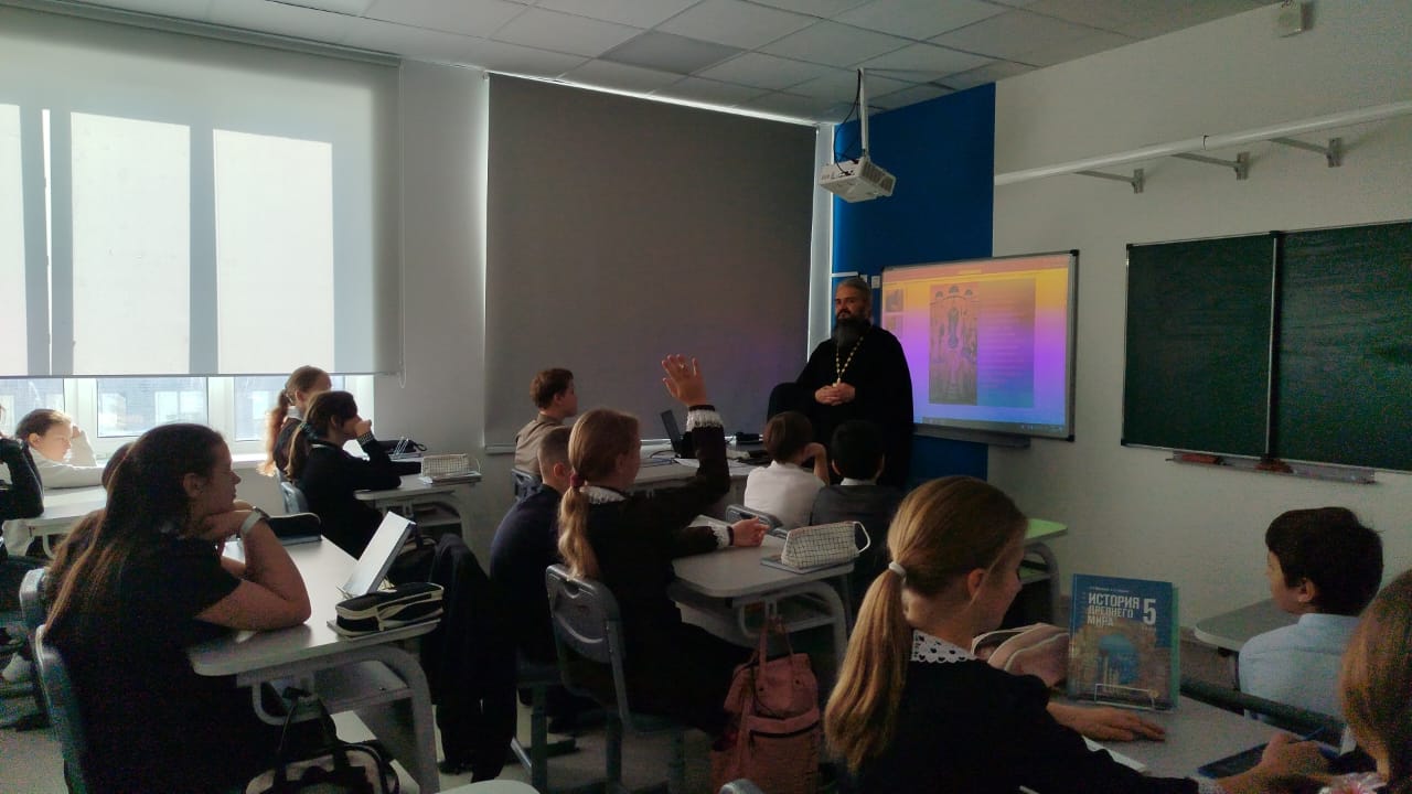 Священник рассказал школьникам о празднике Покрова Пресвятой Богородицы, о том, какие исторические события легли в основу этого праздника, и о том, что Матерь Божья всегда ограждает верующих от всякого зла честным Своим омофором.
