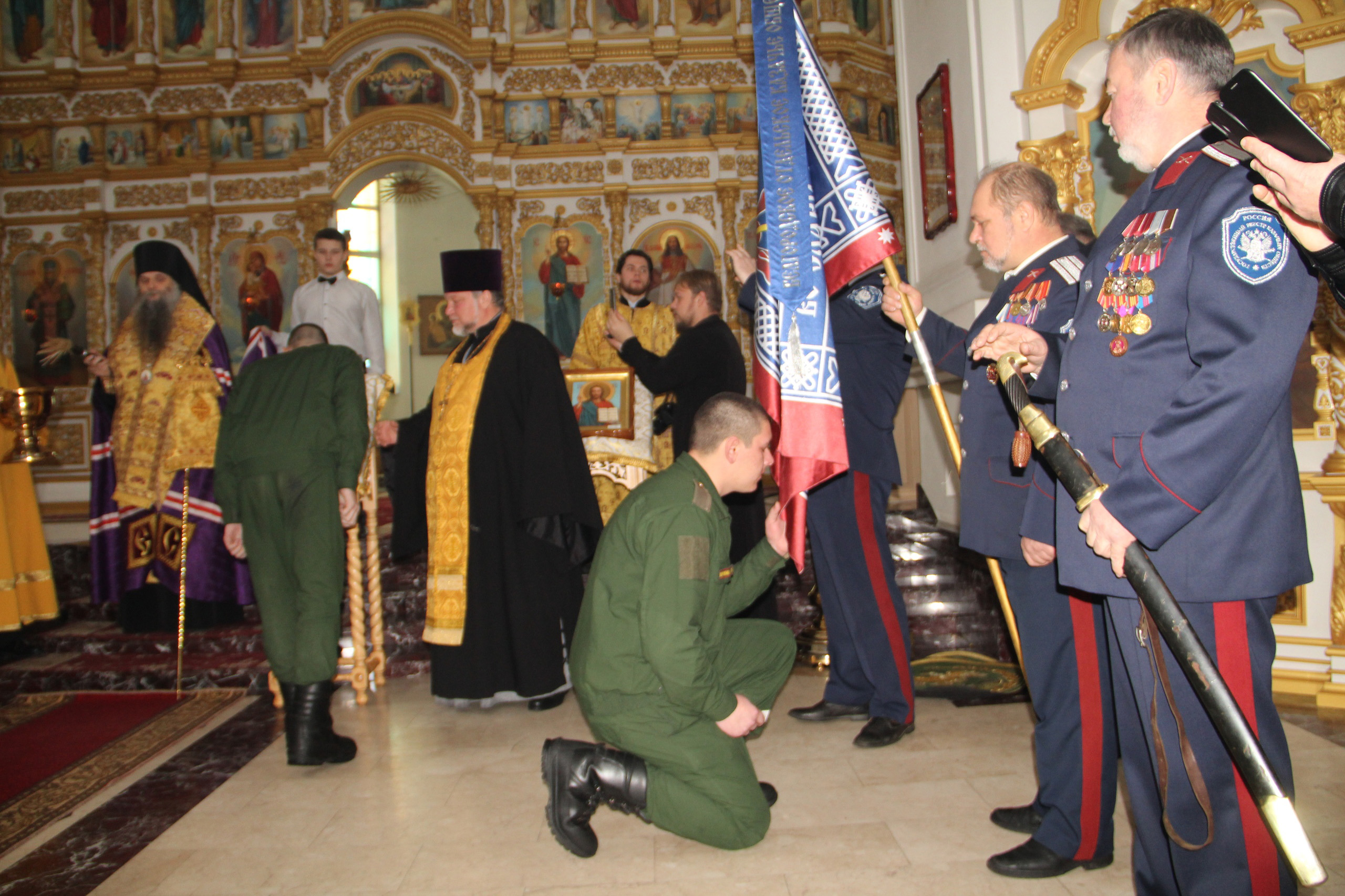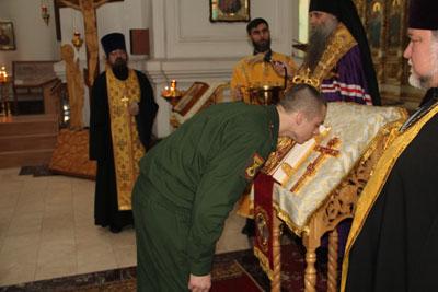 Текст Присяги был зачитан построчно с повторением его новобранцами протоиереем Виталием, а далее, верставшиеся в казаки военнослужащие, лобызая святое Евангелие и Крест, были окропляемы святой водой Владыкой. Каждому из нововерстанеых казаков были вручены иконки святителя Спиридона Тримифунтского, а, затем, припав на правое колено казаки-воины прикладывались к казачьему знамени Белгородского отдельского казачьего общества и целовали, по традиции, шашку.