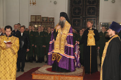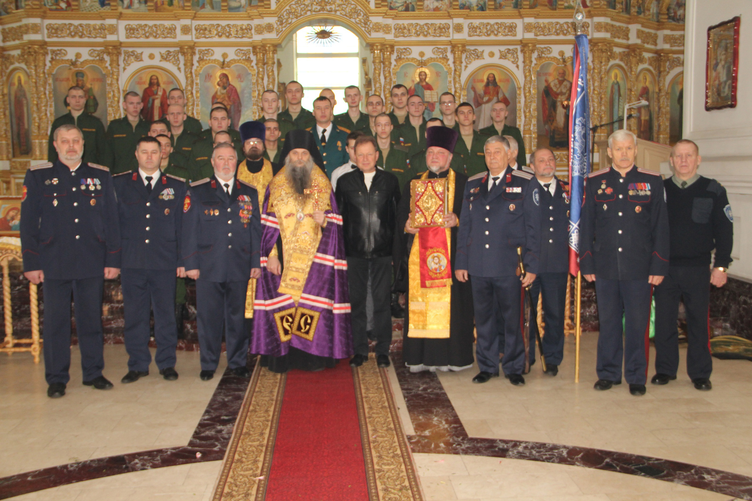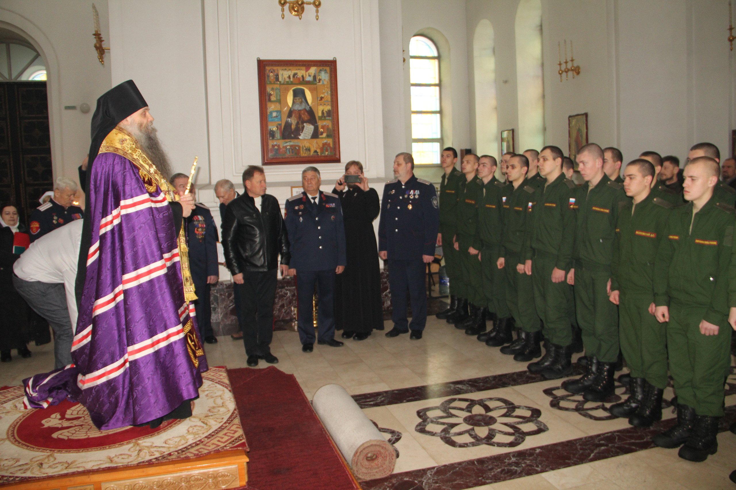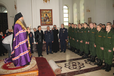 Немаловажным событием стало и то, что благословил новобранцев правящий архиерей Валуйской епархии преосвященный Савва, епископ Валуйский и Алексеевский. Владыка, в сослужении руководителя Отдела по взаимодействию с казачеством протоиерея Виталия Миршавки и ключаря собора иерея Вадима Лебедева, совершил Молебен пение перед началом всякого доброго дела, после чего - обратился с архипастырским словом к воинам - казакам, указав, в частности, на то, что дух казака всегда был подписываем православной верой!